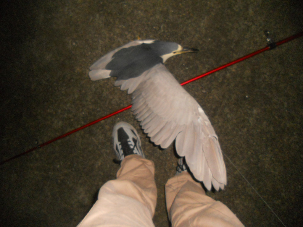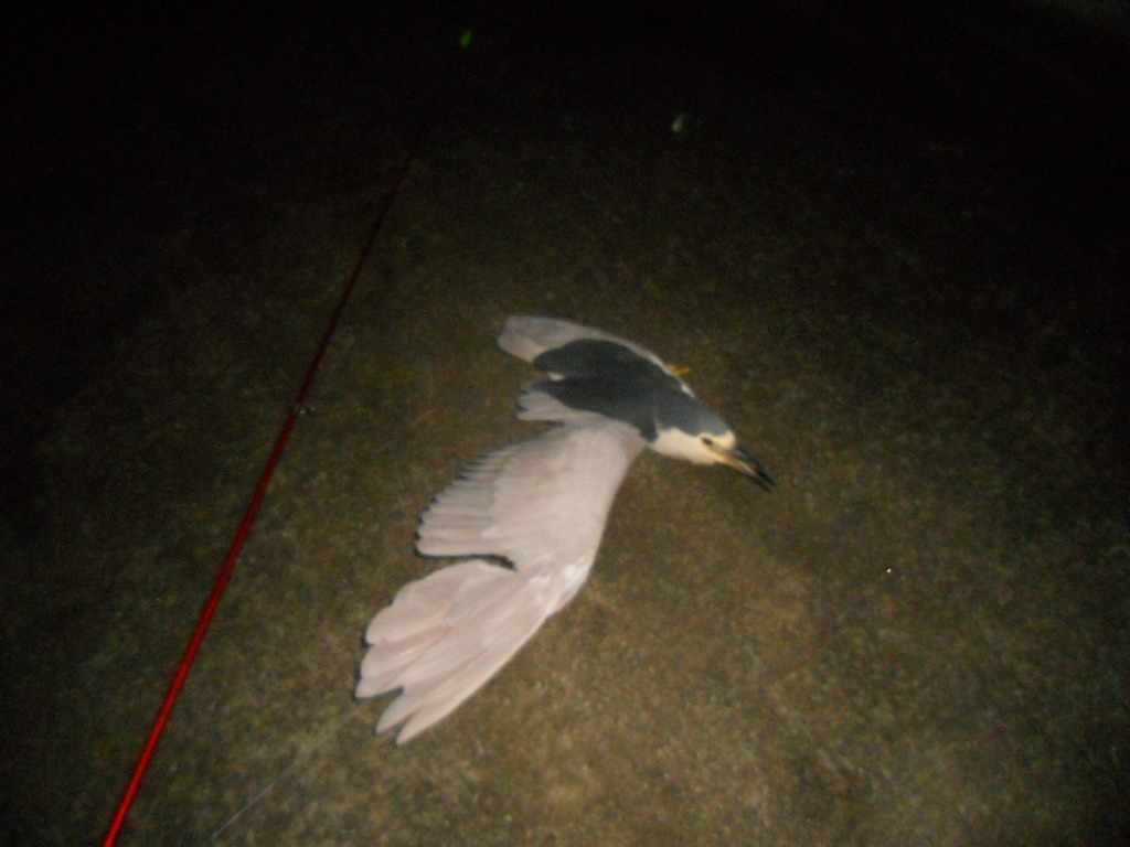 というのはウソで、低空飛行中の鳥がみごと投げ竿の道糸に引っかかって